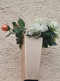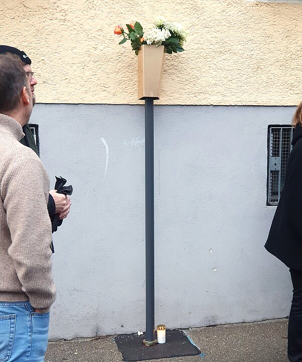 Die Erinnerungsstele steht vor dem Haus Am Katzenstadel 8 in Augsburg.