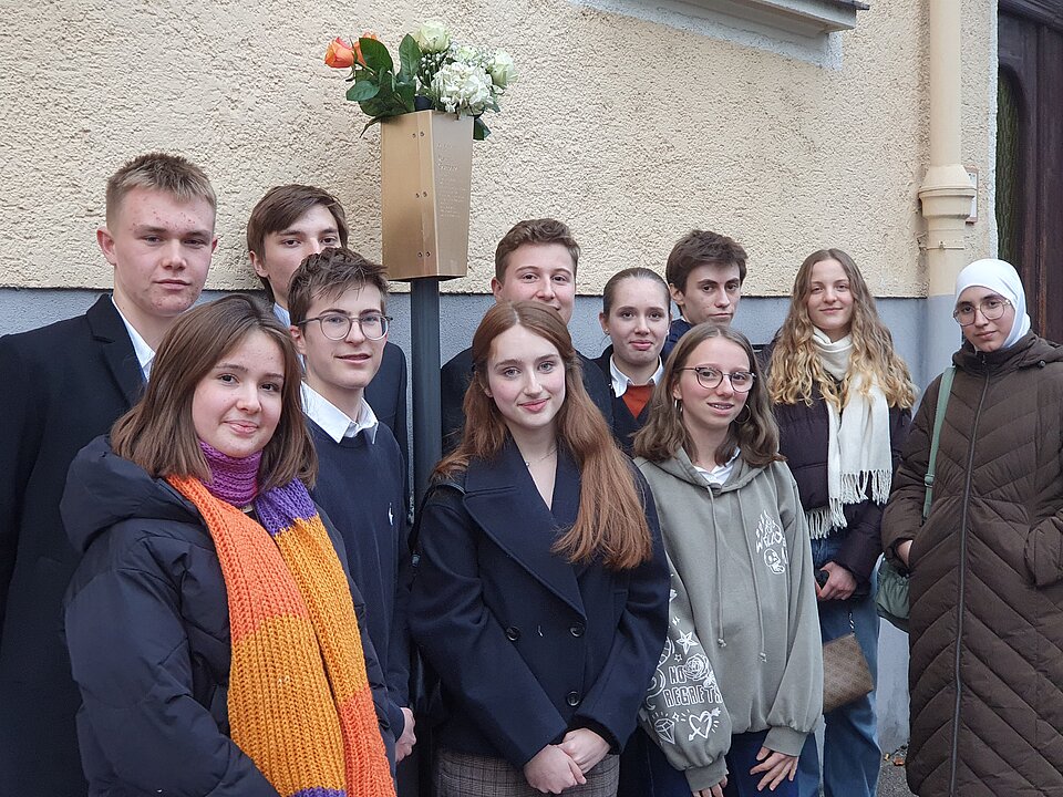 Schülerinnen und Schüler einer 11. Klasse des Peutinger Gymnasiums haben den Lebensweg von Meta Gumperz nachgezeichnet und die Zeremonie vor der Enthüllung maßgeblich organisiert.