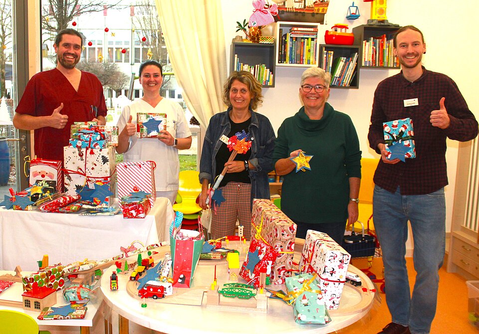Von Minipfeifen, mit denen man einen Ball hochpusten kann, über Baby-Beißspielzeug, Windräder, Seifenblasen oder Filzstifte bis zu kleinen Geschenken wie Autos, Pixi-Bücher Knete oder Haargummis für die Belohnungskiste: Der Soroptimist-Club Augsburg hat kurz vor Weihnachten für viele Stationen der Kinderklinik des Universtitätsklinkums Augsburg wieder kleine, aber wichtige Wünsche erfüllt. Präsidentin Angela Gebler überreichte die Geschenke an die Erzieherin im Patientenkindergarten Claudia Bail und an Leitende verschiedener Stationen. Die Geschenke bereiten nicht nur den Kindern Freude, sondern erleichtern Ärzten auch verschiedene Untersuchungen. Der Soroptimist-Club wird seine Unterstützung auch im nächsten Jahr fortsetzen.